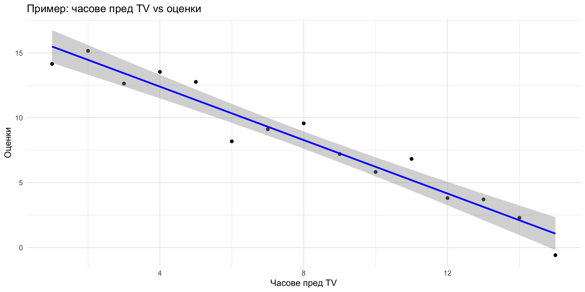 - Пример: Броят на часовете, прекарани в гледане на телевизия, се увеличава, оценките са склонни да намаляват.