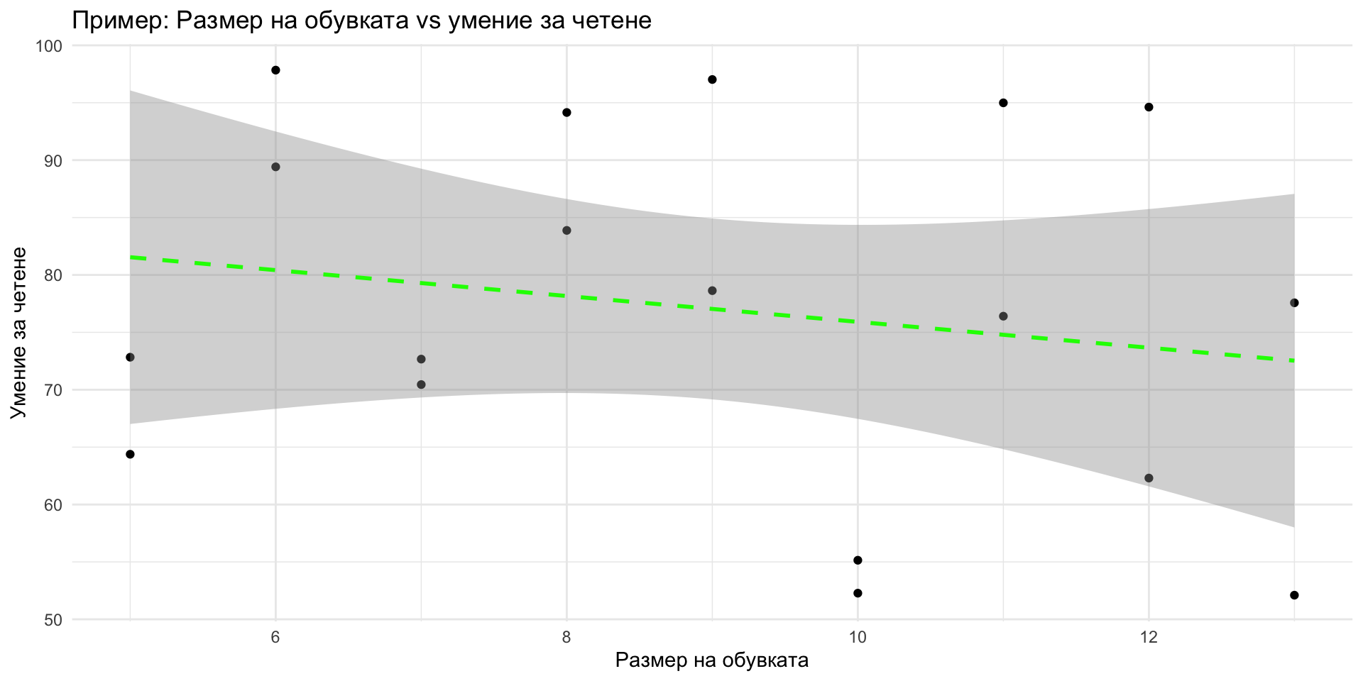 - Пример: Размер на обувката и умение за четене при възрастни.
